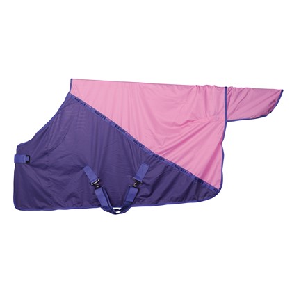Two-tone mesh horse rug, suitable as a fly rug or cooler rug, with a single Velcro front closure, two cross surcingles, a tail loop, and a polyester-lined chest to prevent rubbing.