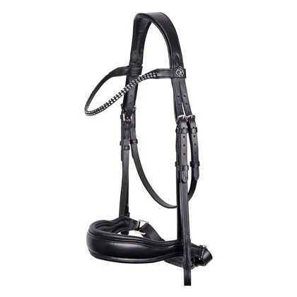 This bridle is equipped with crystals on the browband and blind closures on cheekpieces and web reins